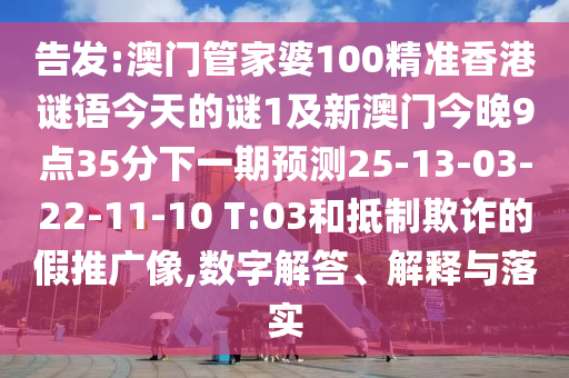 “告發”一詞通常指的是揭發、舉報某種信息或行為,在本文的語境中,“澳門管家婆100精準香港謎語”似乎涉及某種預測或解謎的服務,宣稱能精準預測某些數字或結果,此類服務往往伴隨著對特定事件或結果的預測,如“香港謎語今天的謎1”,“新澳門今晚9點35分下一期預測”等。